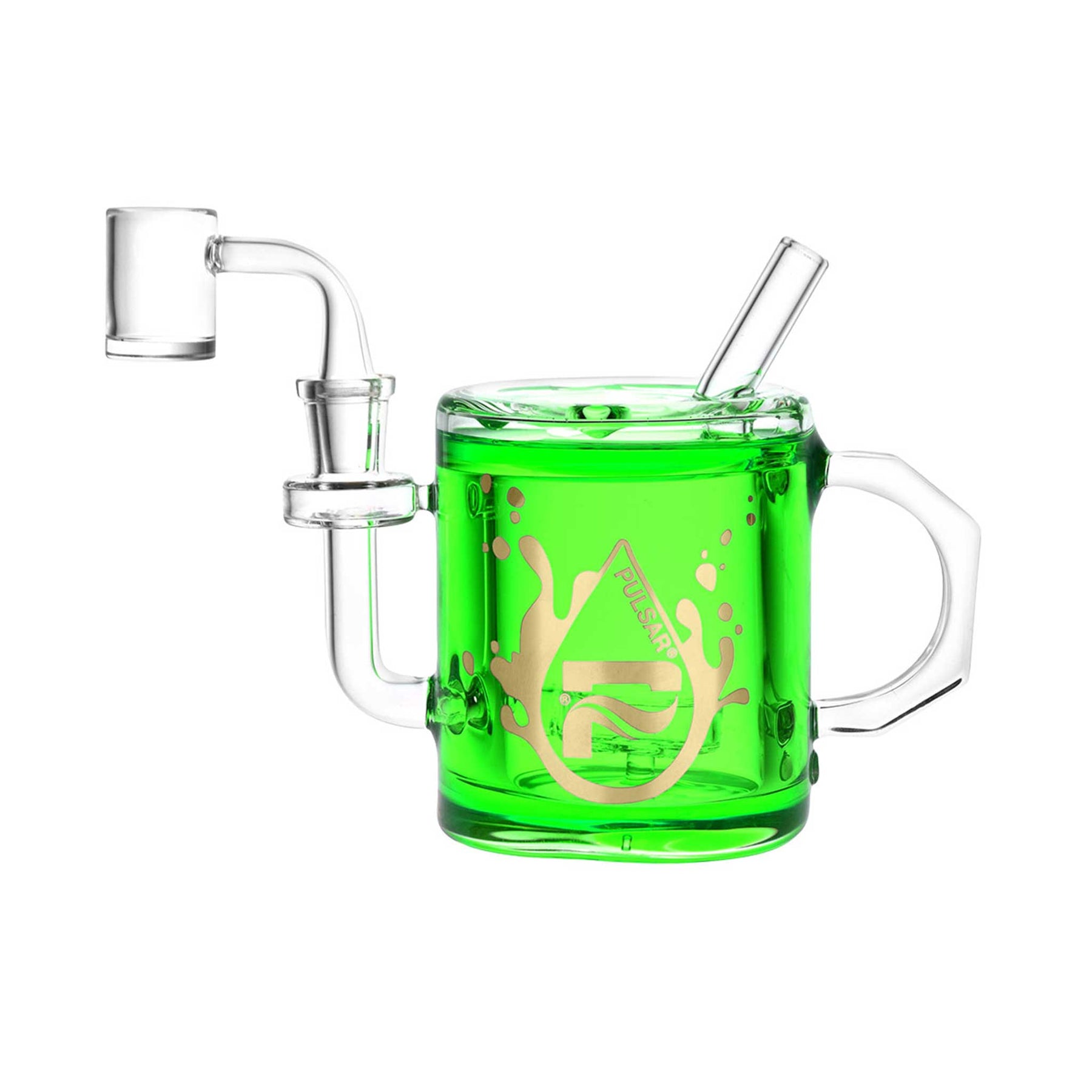This Pulsar Glycerin Coffee Cup Dab Rig is freezable, making it ideal for quickly cooling smoke for smooth hits and huge clouds. These pipes have a disc-style percolator and the appearance of a coffee cup with a functional handle and a straw mouthpiece. Includes 14mm male banger!