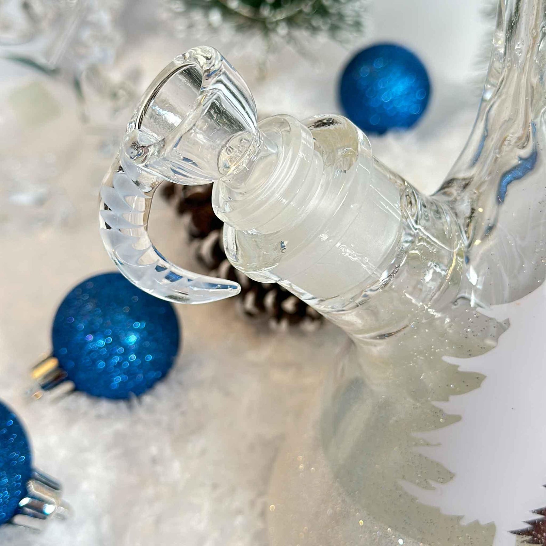 This unique 14-inch Winter Wonderland-themed bong is the perfect addition to your holiday traditions or snowy days. The light holographic base, textured silver and white trees, and snow-inspired design make it a standout piece. Comes with a cool upgraded horned bowl. Keep your bong clean with standard rock salt and 99% alcohol or bong-specific cleaner. Wash the outside with Dawn soap and lukewarm water. Avoid soaking in hot water or leaving in the sun to prevent damage to the protective resin layer.What's in the box: