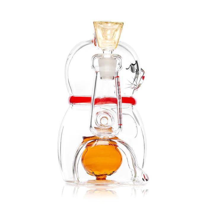 Indulge in the spirit of good fortune with the LUCKY CAT XL BONG - a lavish work of art embodying the charm of the beloved lucky cat and guaranteeing plentiful smoking sessions. Adorned with eye-catching cat face decals on clear glass and accompanied by a dazzling Gold Brick Bowl, this XL edition elevates the allure and grandeur to new heights.